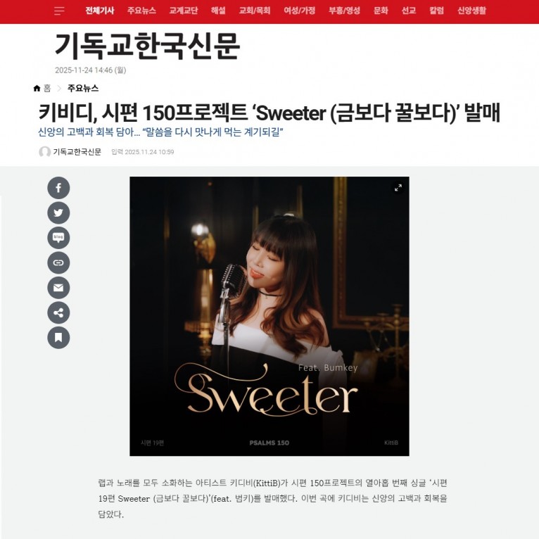 [기사] 키비디, 시편 150프로젝트 ‘Sweeter (금보다 꿀보다)’ 발매(기독교한국신문)